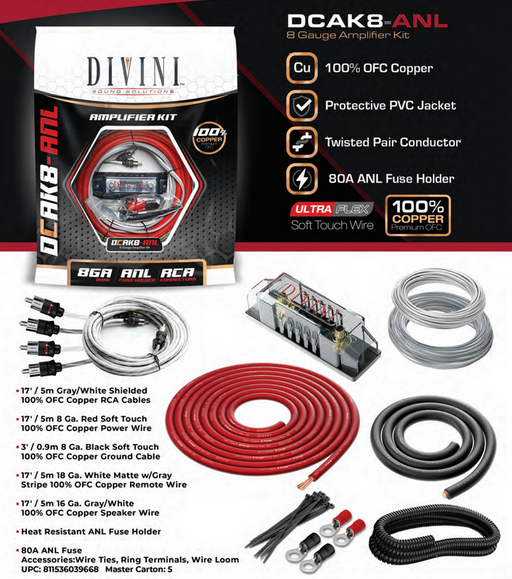 DB DRIVE DIVINI DCAK8ANL - 8 GAUGE AMP WIRING KIT Features: 100 % OFC Twisted Pair Conductor Protective PVC Jacket 80 Amp ANL Fuse Holder Ultra Fl...
